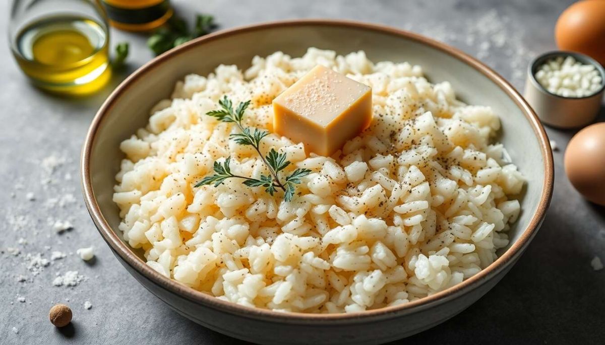 Une fois que le riz est cuit et crémeux, ajoutez le parmesan râpé et mélangez bien.