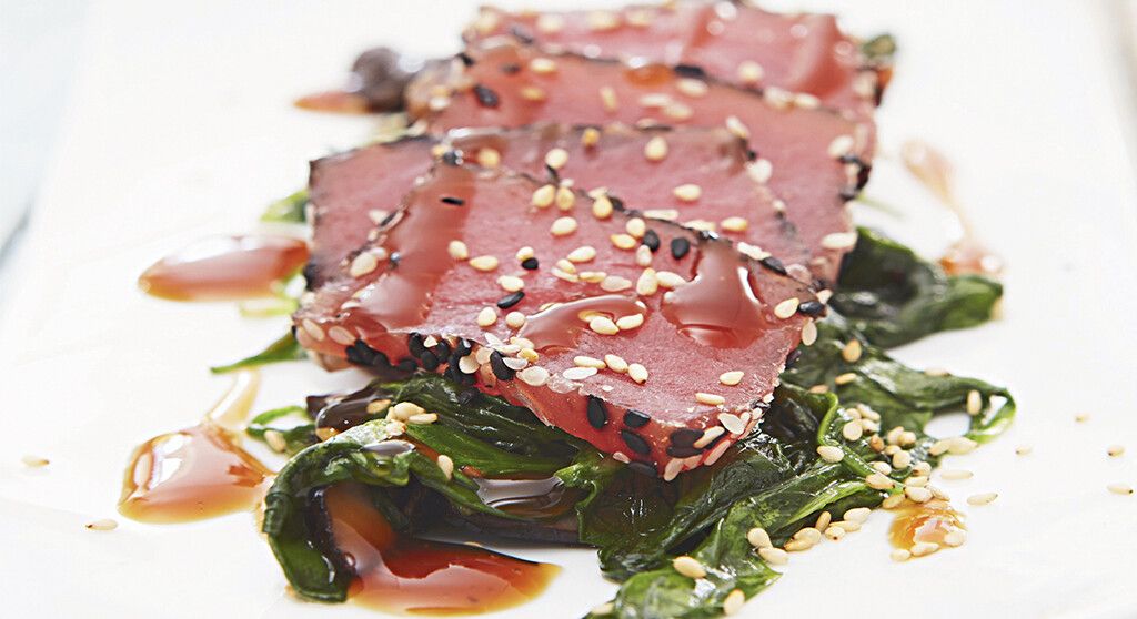 - Saisissez les steaks de thon pendant 30 secondes de chaque côté, puis tranchez-les en gros morceaux. Disposez-les sur le lit d'épinards et nappez délicatement de sauce réduite.