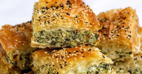 Un peu plus populaire, la spanakopita est une tourte garnie d'épinards et de feta, enveloppée dans une pâte filo croustillante. La différence clé avec la kolokithopita réside dans l'utilisation de courgettes plutôt que d’épinards. La préparation des légumes doit également être soignée, notamment en les dégorgeant avant de les utiliser. D’autres variantes telles que la hortopita, réalisée avec des légumes verts, ou la prasopita avec des poireaux, courent également les rues de Grèce.