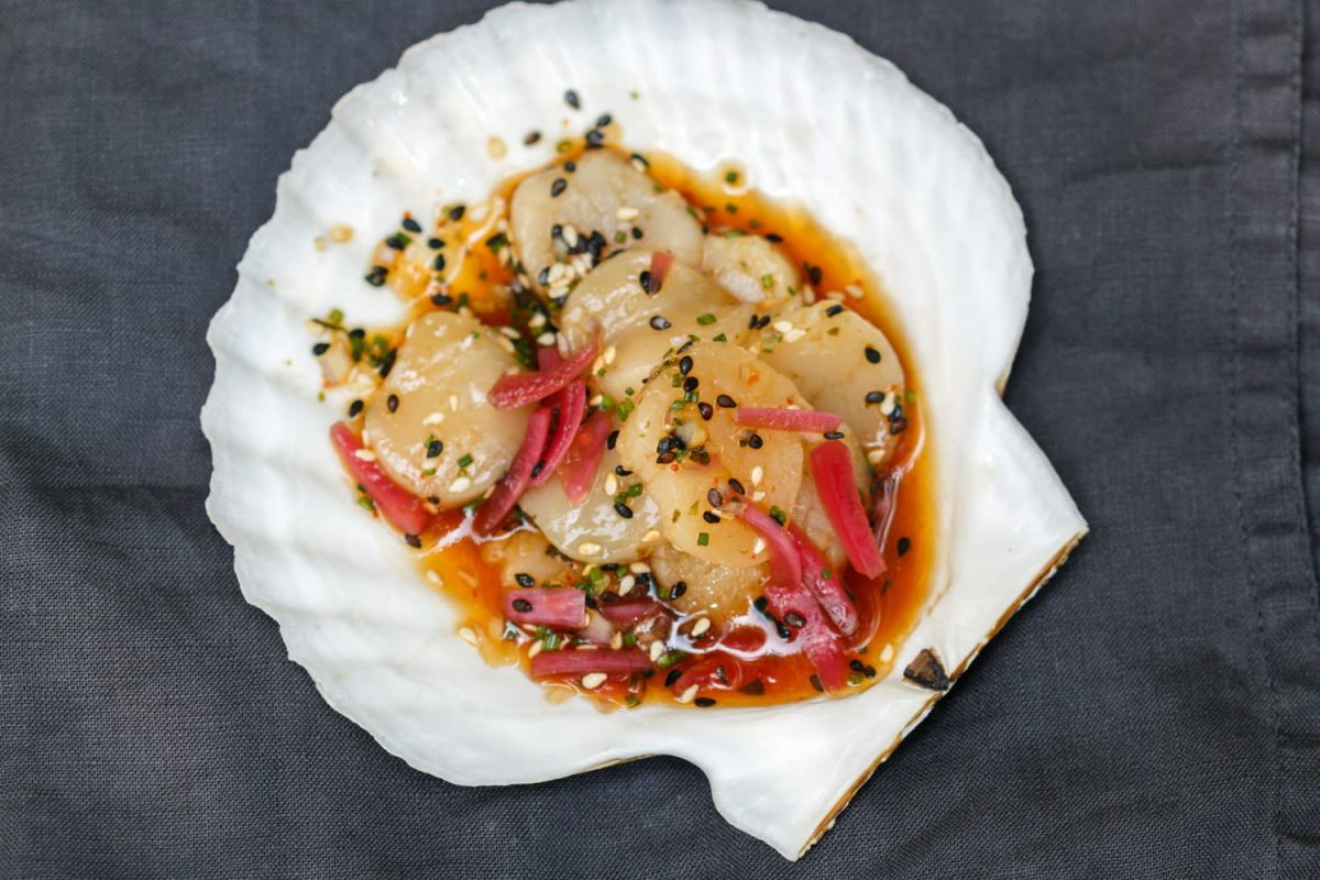 - Arrosez les Saint-Jacques de vinaigrette au sésame et nappez-les de sauce au miso. Caramélisez délicatement avec un chalumeau, parsemez de sésame grillé et ajoutez un zeste de citron vert.